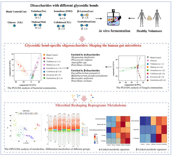 该研究通过选取六种具有不同糖苷键的二糖(海藻糖α-1,1、麦芽糖α-1,4、异麦芽糖α-1,6、纤维二糖 β-1,4、β- 乳糖 β-1,4、龙胆二糖 β-1,6),以10 mM 浓度构建体外粪便厌氧发酵模型,系统探究了糖苷键类型对肠道微生态(细菌与真菌群落)及其代谢活动的调控差异。研究发现,α- 型二糖(麦芽糖、异麦芽糖)的代谢速率显著快于β- 型二糖(纤维二糖、龙胆二糖),且能更显著提升肠道细菌与真菌的丰富度(Chao1、ACE 指数)和多样性(PD whole tree 指数);两类二糖均能显著富集有益菌Megamonas funiformis(产丙酸关键菌)与Phocaeicola vulgatus(改善糖代谢相关菌),同时降低潜在致病菌肺炎克雷伯菌的丰度,而β-型二糖还额外促进产丁酸菌 Faecalibacterium prausnitzii 与Paraprevotella clara 的增殖。在真菌调控方面,尽管整体影响弱于细菌,但异麦芽糖(α-1,6)与龙胆二糖(β-1,6)可通过减少机会致病菌 Candida africana 丰度、促进产生物活性代谢物的Penicillium citrinum 生长,特异性改变真菌群落结构;此外,α-型二糖能增强核心微生物间的相互作用,而代谢层面上,海藻糖与纤维二糖对总短链脂肪酸(SCFAs)提升效果最显著,β-型二糖(尤其是纤维二糖)更易提高丁酸(肠道健康关键代谢物)水平,同时α- 型二糖会上调L - 脯氨酸(抗氧化氨基酸)与甘油磷脂,β-型二糖则增加具有保肝作用的脂肪酸delta2-THA。