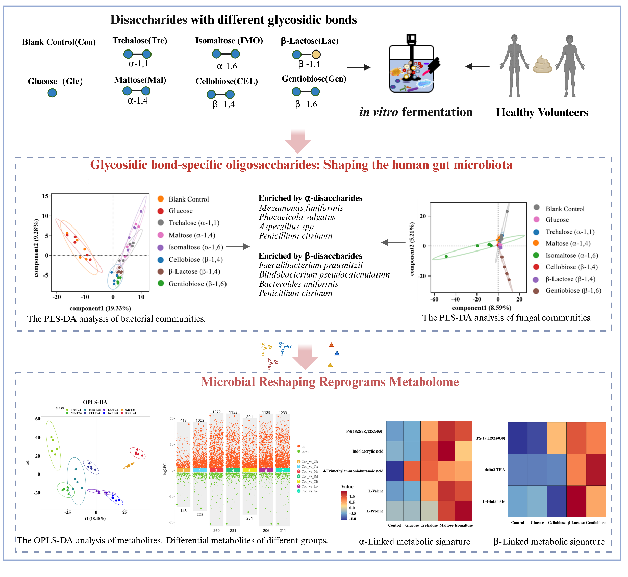 摘要 | Oligosaccharides significantly impact host health by modulating gut microbial composition and metabolic activities. However, the influence of oligosaccharides with different glycosidic bonds on intestinal microecology remains unclear, hindering their functional food applicability. This study examined the impact of six disaccharides, including trehalose (α-1,1), maltose (α-1,4), isomaltose (α-1,6), cellobiose (β-1,4), β-lactose (β-1,4), and gentiobiose (β-1,6), at concentrations of 10 mM. The results showed that α-disaccharides (maltose and isomaltose) were metabolized faster than β-disaccharides (cellobiose and gentiobiose). They also significantly increased both bacterial and fungal richness (Chao1 and ACE indexes) and diversity (PD whole tree) compared to β-disaccharides (p < 0.05). Both α- and β-disaccharides significantly enriched Megamonas funiformis and Phocaeicola vulgatus while reducing Klebsiella pneumoniae abundance. Notably, β-disaccharides enhanced Faecalibacterium prausnitzii and Paraprevotella clara proliferation. Despite a less pronounced effect on fungi than bacteria, isomaltose and gentiobiose substantially altered fungal composition by reducing Candida africana abundance and ing Penicillium citrinum growth. These oligosaccharides ed complex gut microbial networks, with key taxa including Occultifur kilbournensis, Ruminococcaceae bacterium, and Streptococcus salivarius. Notably, α-oligosaccharides increased core microbial interactions. The gut microbial composition affected short-chain fatty acids (SCFAs) production, with trehalose and cellobiose showing the greatest enhancement. Additionally, β-disaccharides, particularly cellobiose, were more successful in increasing the butyric acid levels than α-disaccharides. Metabolomic profiling indicated that α-disaccharides upregulated antioxidative amino acids (e.g., L-proline) and glycerophospholipids, while β-disaccharides increased delta2-THA, a hepatoprotective fatty acid. This study highlights the differential modulation of gut microbiota and metabolism by disaccharide glycosidic bonds, providing insights into their functional roles. |