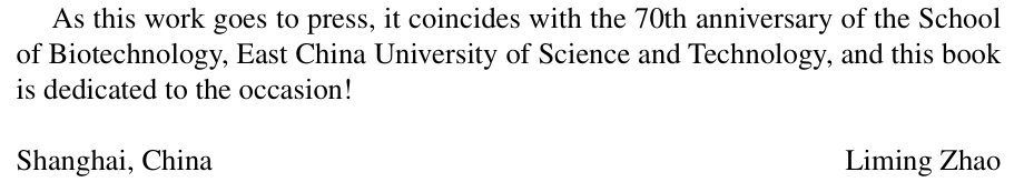 恰逢华东理工大学生物工程学院办学70周年庆。赵黎明教授在书序中表示:“拙作付梓之际,欣逢学院70周年院庆,谨以此书致贺!”
